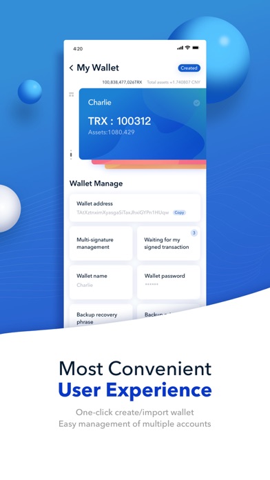 一键创建/导入钱包,支持HD钱包,支持蓝牙导入Ledger钱包,还可以创建多个钱包账户,简便易用,轻松上手。